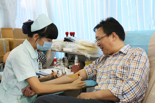 10月11日,职工服务中心门前人头攒动、热闹非凡,由我公司组织的无偿献血活动正在这里举行。公司董事长、总经理余华强同志带头献血,前来献血的干部员工络绎不绝。医生、护士们填卡、体检、验血、采血,忙得不亦乐乎。采血车上更是坐满了正在献血的员工。据统计,全天共有114人献血,共采集血液总量高达41100多毫升,为保障全市临床用血需求作出了我们应有地贡献。