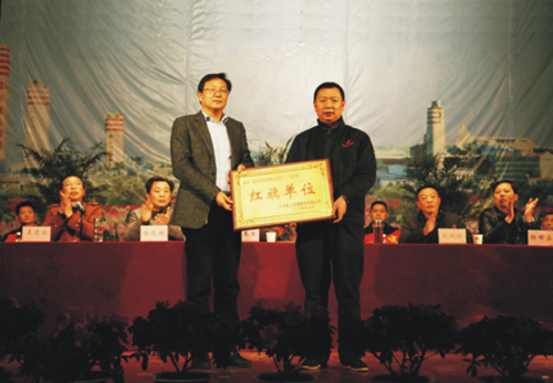 余董事长为荣获红旗单位的农贸公司磷复肥分公司颁奖