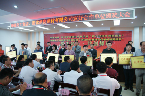 上午10点30分,我公司在生产销售大楼五楼会议室举行了隆重的颁奖仪式,为来自全国的29家“优质供应商”和“优质工程建设单位”颁发了奖牌。下午3点整,我公司组织500余位客商来公司现场参观,10余辆旅游大巴满载着尊贵客人驶进华强化工。客商们先后参观了复合肥生产线、精细化工园区、尿素生产线和生活区,各位客商无不为华强化工的跨越式发展而感叹。下午6点整,集团公司董事长、总经理余华强同志在当阳宾馆举行盛大欢迎宴会,热情款待全体贵宾。晚宴结束后,远道而来的客商在热烈地鼓乐声中,乘车来到了流光溢彩的华强广场,进入文体中心观看文艺演出。华强人自编、自创、自演的大型舞蹈《从头再来》、配乐诗朗诵《凤凰山下化工城》和表演唱《华强工人多风采》等精彩节目,博得客商们的阵阵掌声。